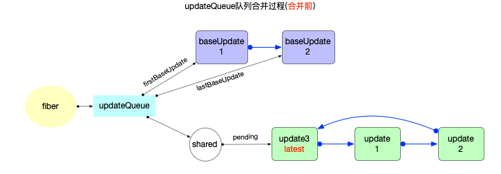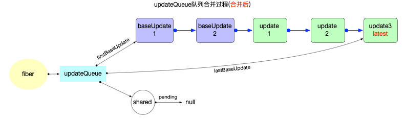 • 在fiber树构建阶段(或reconciler阶段), 会把fiber.updateQueue.shared.pending合并到fiber.updateQueue.firstBaseUpdate队列上(源码地址).