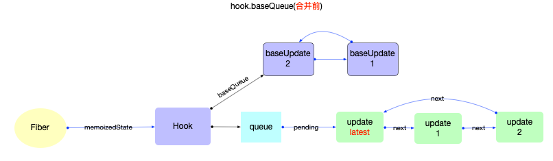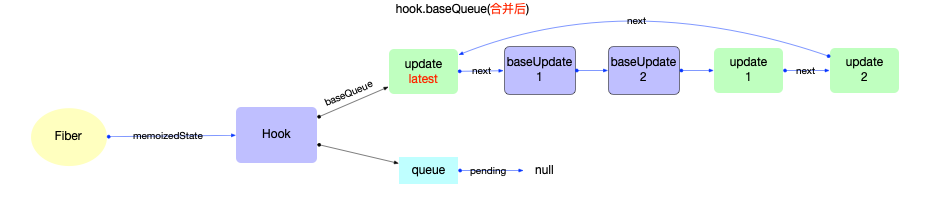 • 在fiber树构建阶段(或reconciler阶段), 会将hook.queue.pending合并到hook.baseQueue队列上(源码地址).