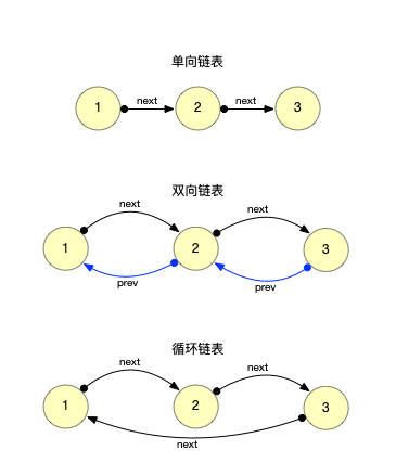 1. 单向链表: 每个节点包含两个域, 一个信息域和一个指针域. 这个指针指向列表中的下一个节点, 而最后一个节点则指向一个空值.