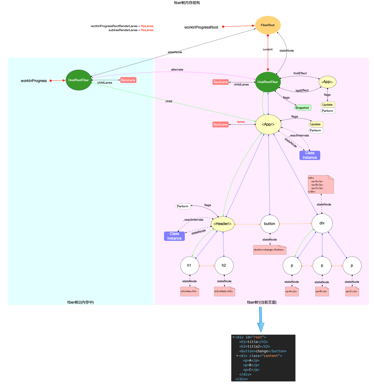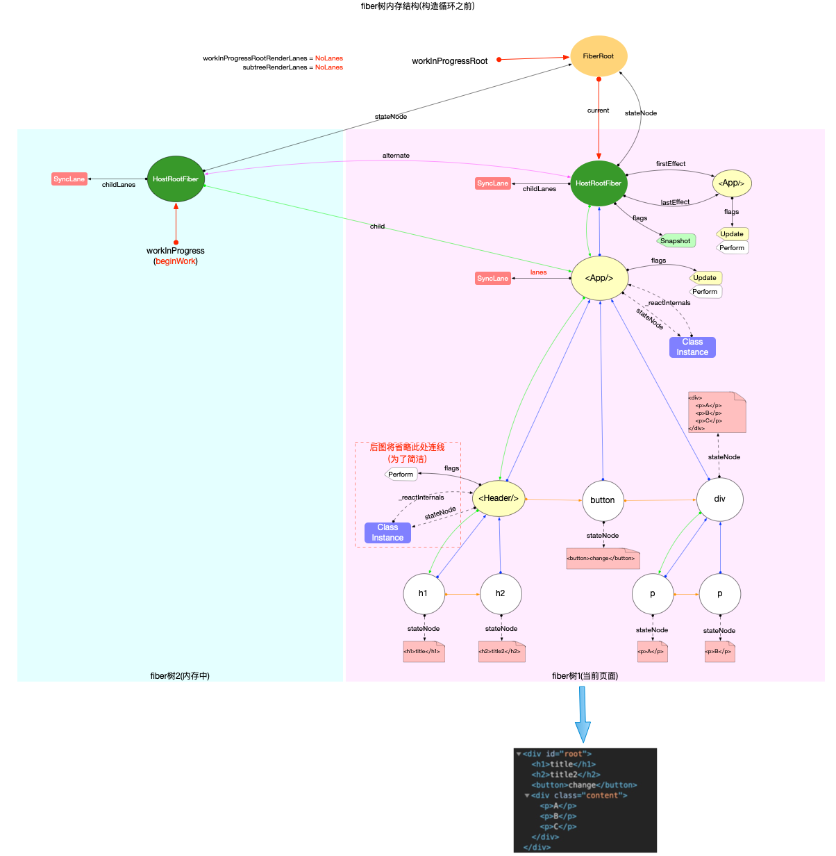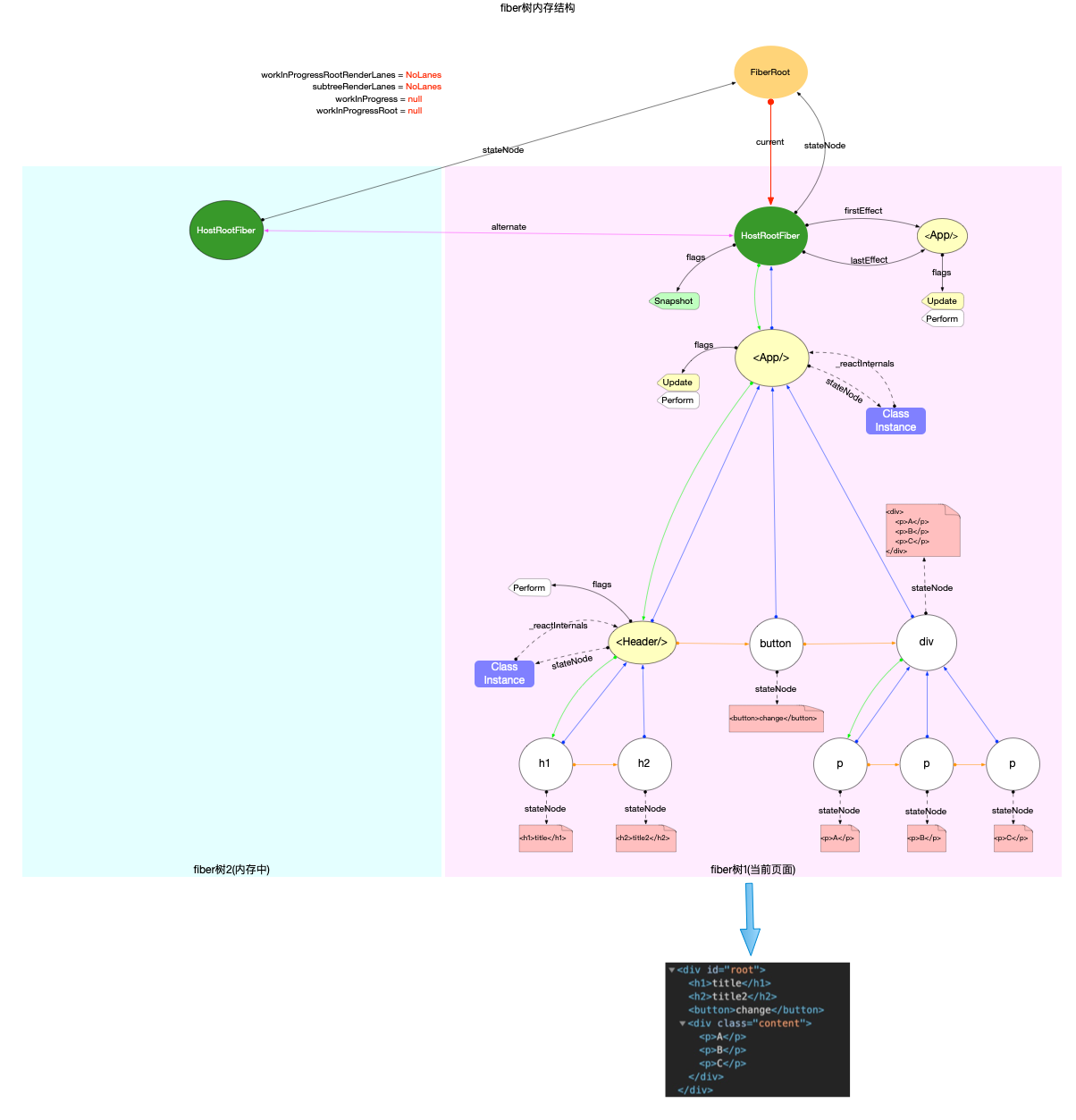 在初次渲染完成之后, 与fiber树相关的内存结构如下(后文以此图为基础, 演示对比更新过程):