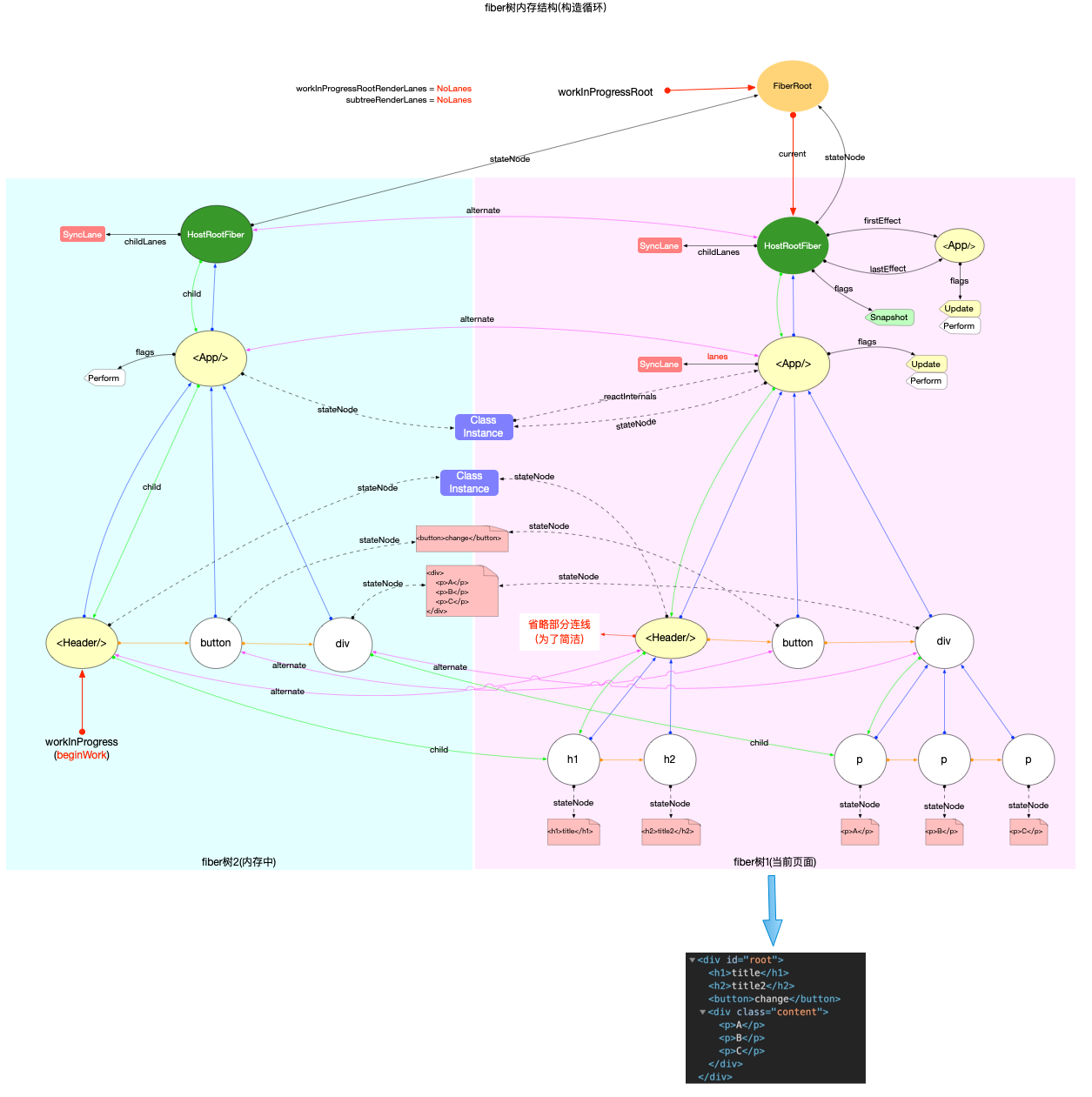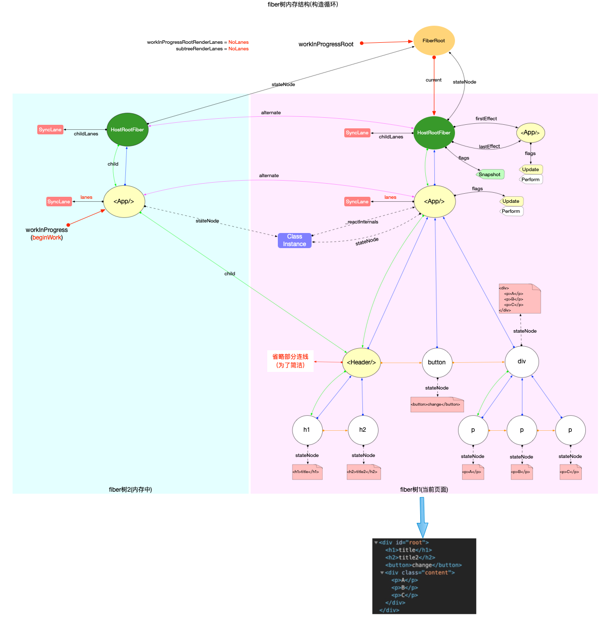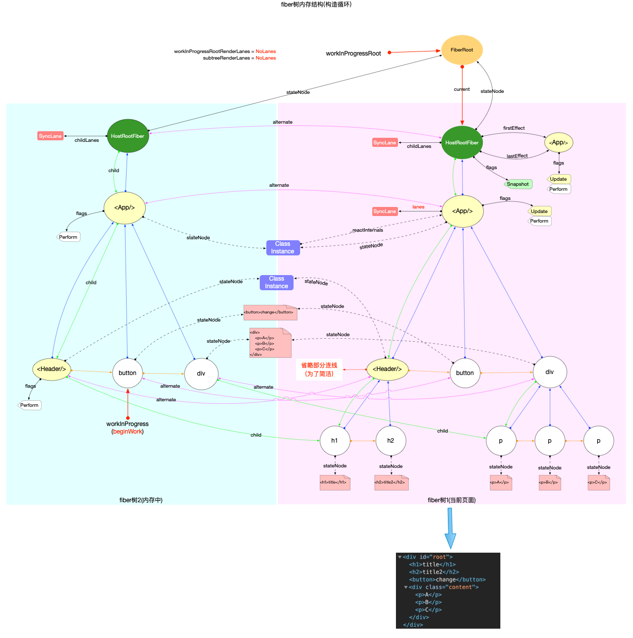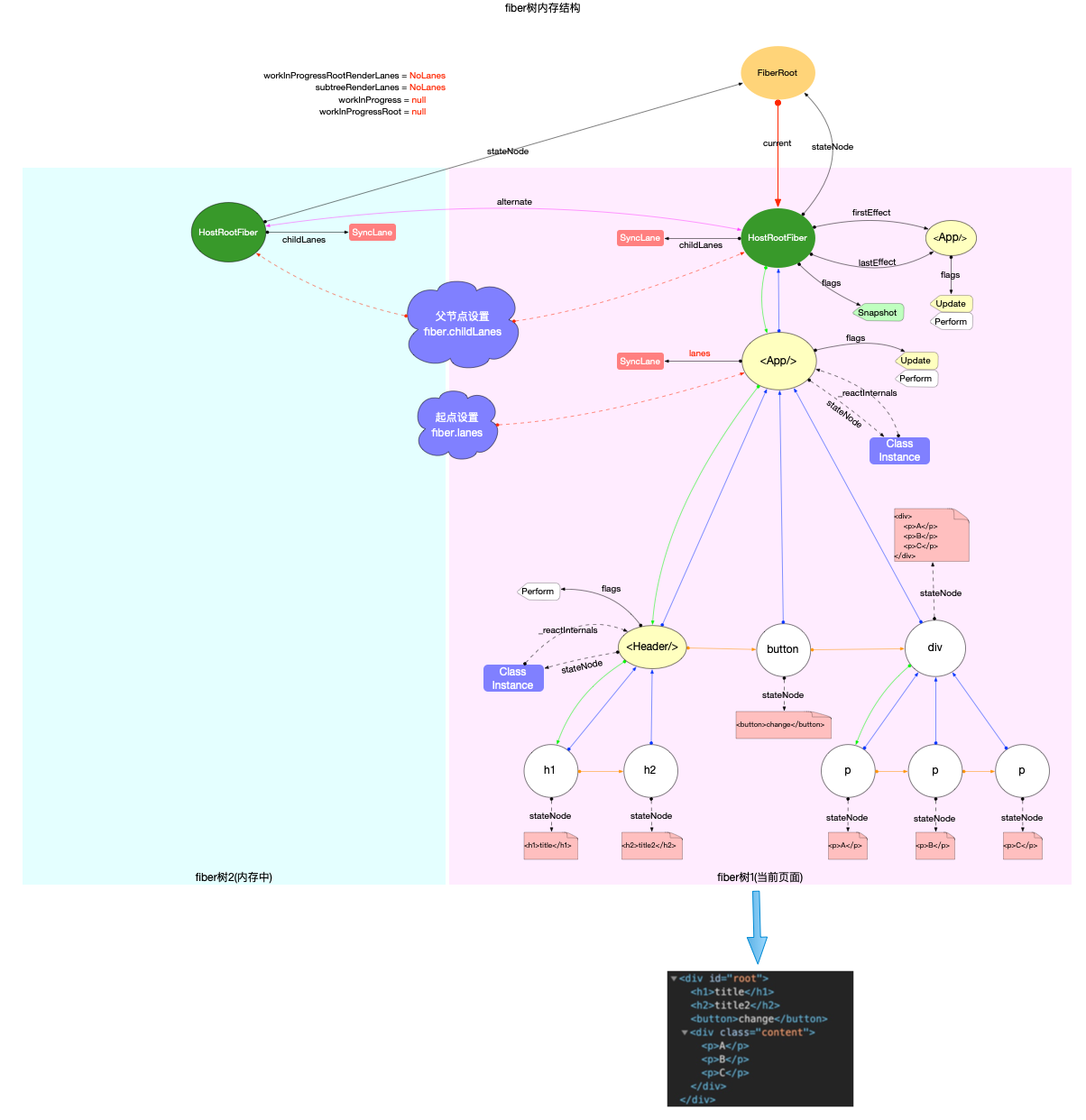 在初次渲染完成之后, 与fiber树相关的内存结构如下(后文以此图为基础, 演示对比更新过程):