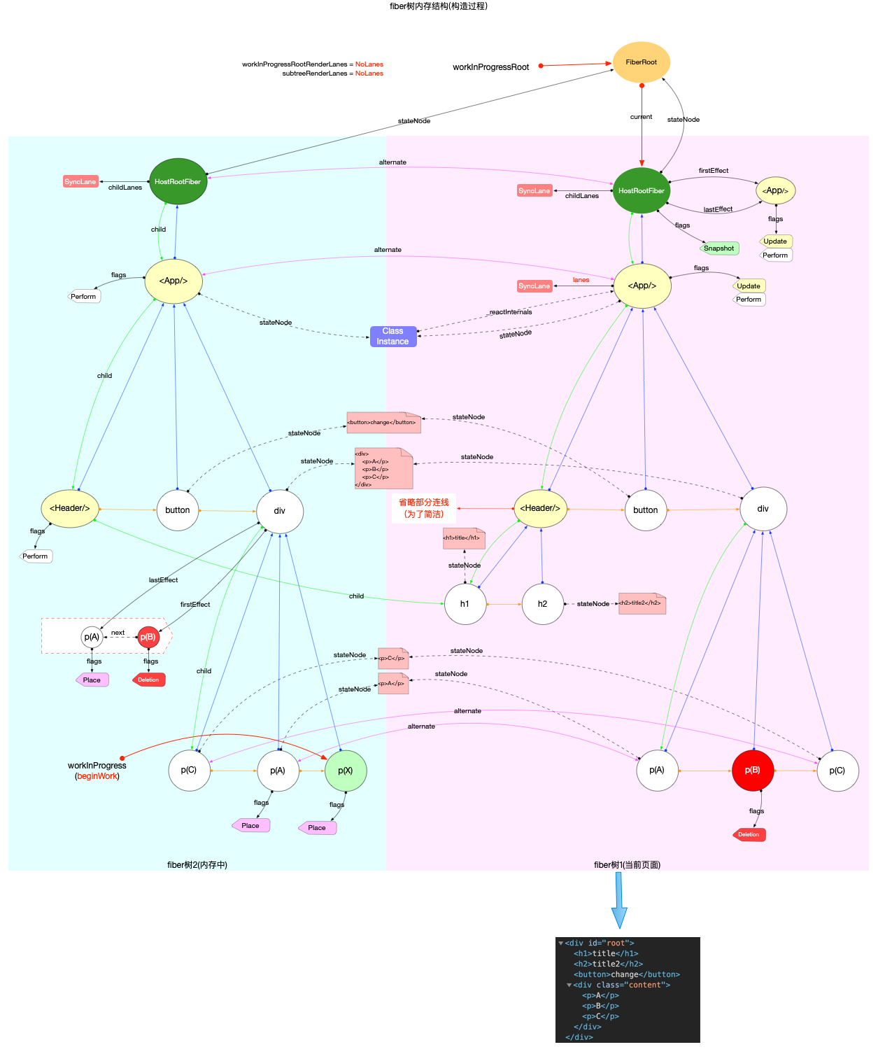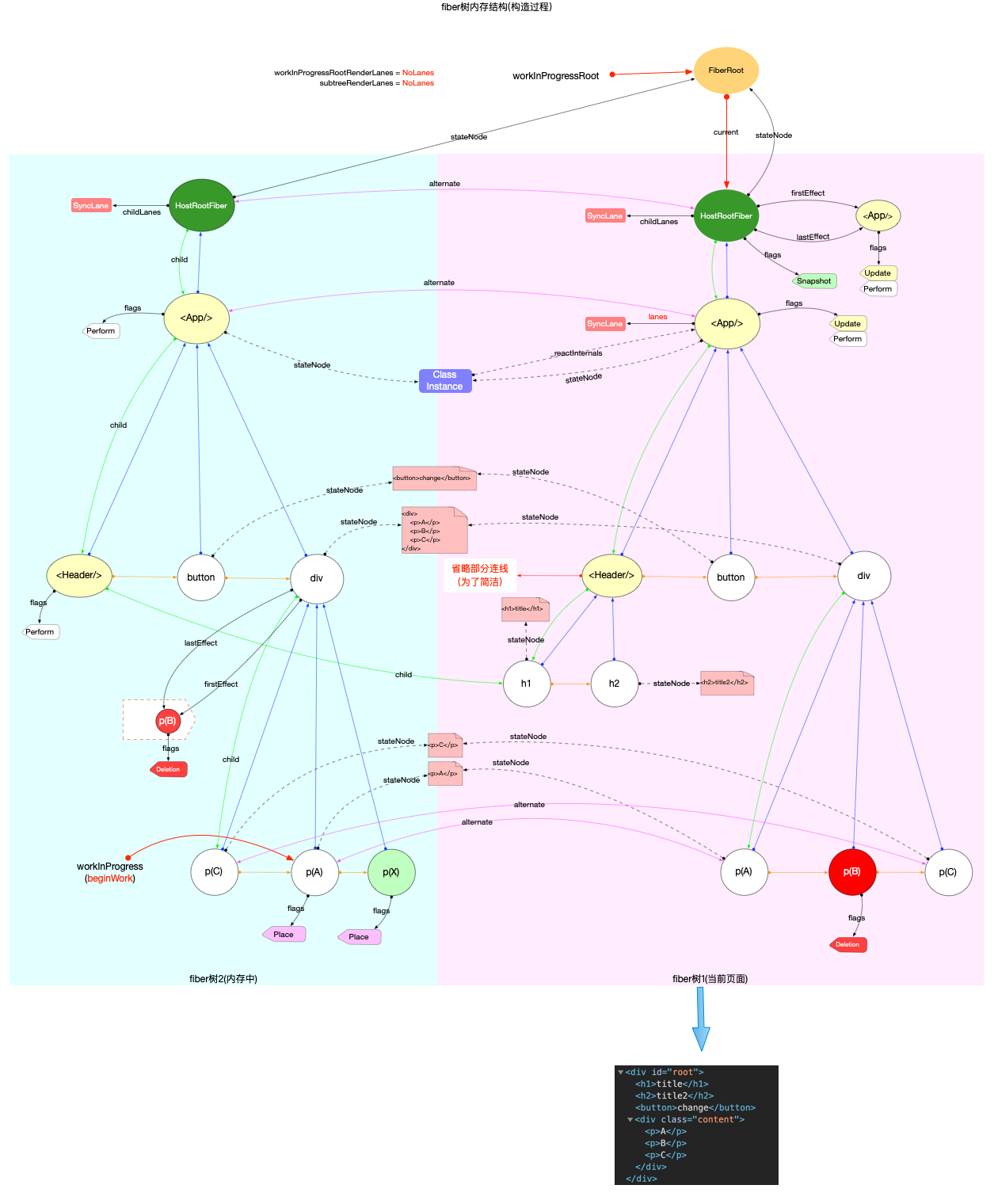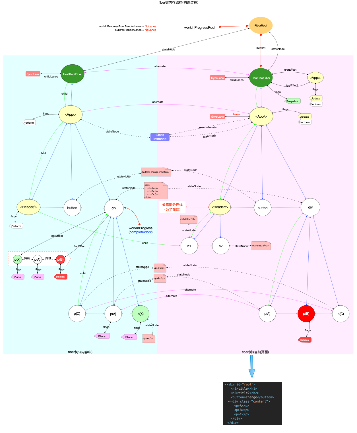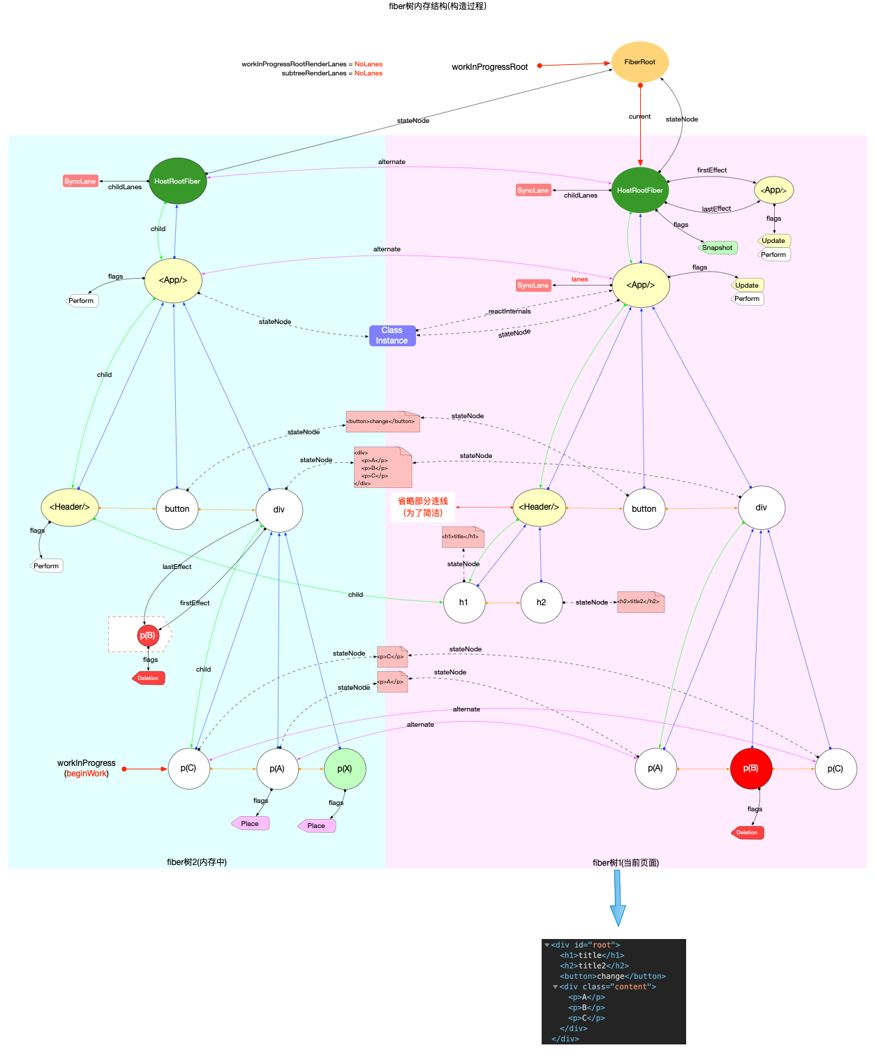 本节演示了更新阶段fiber树构造(对比更新)的全部过程, 跟踪了创建过程中内存引用的变化情况. 与初次构造最大的不同在于fiber节点是否可以复用, 其中bailout逻辑是fiber子树能否复用的判断依据.